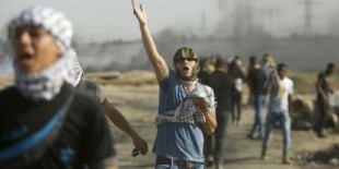 Para demonstran Palestina bereaksi terhadap gas airmata yang ditembakkan tentara Israel. Kekerasan terbaru ini telah menewaskan puluhan orang.